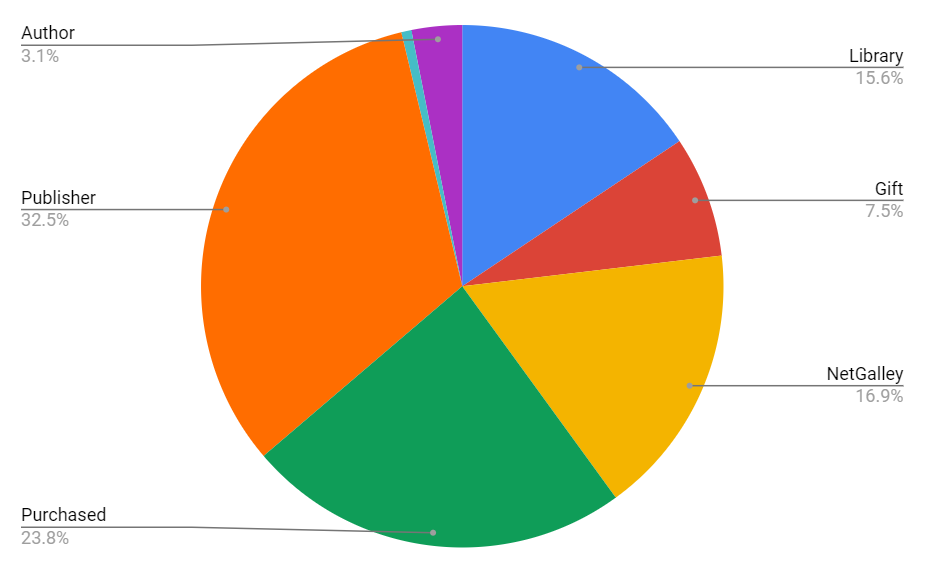 There are definitely some changes on this one! One change I made this year was I combined gifts that I have purchased and books that I've received as gifts into one 'owned' category. Still, I read more in the owned slice (25.3%) than last year's gifted and purchased combined (2.3%+11.5%), so it's always good to see I'm reading books off my shelves, haha. NetGalley is down a little this year at 17.5% (23.8% last year), but I do think I made it through ebooks a bit more slowly this year for some reason. My library usage (31.2%) apparently doubled this year, so hooray for that! I love my library, and I also love being able to use the Libby app to more easily access audiobooks. Publisher (24.7%) also decreased slightly, but I think that's because I tried to focus on some of the books I already owned as well last year. I also included author (1.3%) as a source, since I do still occasionally review books from authors who directly request a review! I used to do a lot more of these, but it's tapered off a bit in recent years.
