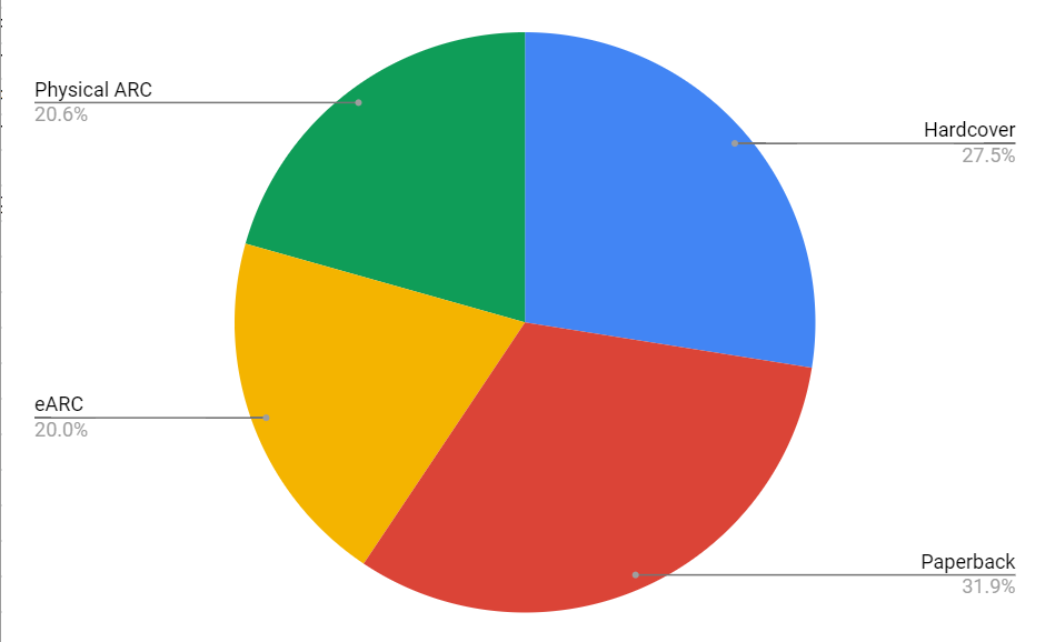 These are surprisingly stable, as well. The biggest change is hardcover, which was 6.7% last year and is up to 14.9% this year. I chose not to separate out finished copies sent from publishers from library/owned copies, so that could account for it a bit this year as well. Physical ARCs also decreased slightly to 20%, though I feel like I got more finished copies than ARCs this year for some reason from publishers. Audiobooks only went up one percent (37%) from last year, and eARCs went down to 15.6%. It's still wild to me sometimes that audiobooks make up such a big part of my reading considering how much I struggled with them in the past, but now I really enjoy them.