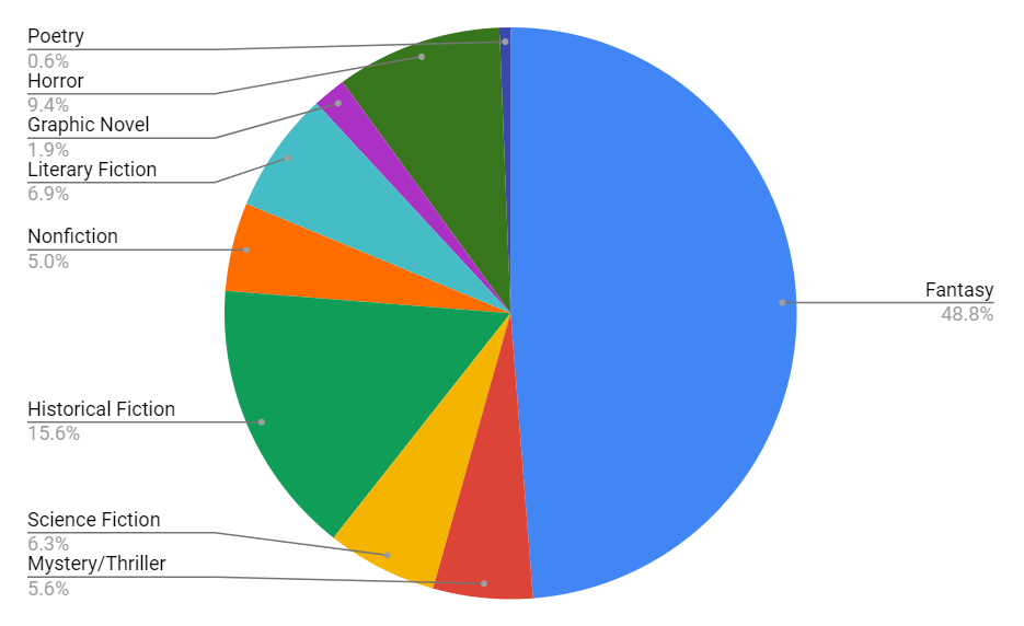 Some of these numbers are ridiculously similar to last year, so I guess I can be fairly consistent. This year, my fantasy slice (38.3%) is just about the same as last year (38.6%), and my historical fiction is also about the same as last year (6%). I did mean to read more historical fiction this year because I really do love it, but I guess that didn't really happen, haha. I thought my horror slice (22.8%) would be bigger this year because I felt like I read a lot of horror, but it was actually slightly lower than last year (25%), and I am wondering if I included any thrillers in the horror section last year. This year I have a general 'fiction' category (9.4%) that includes general fiction and literary fiction, and that is relatively the same. My science fiction slice (8.7%) declined a bit, but my nonfiction is probably what increased the most–from 2.3% last year to 11.4% this year! I really did read a decent bit of nonfiction this year, and that's something I'd love to keep up this year.