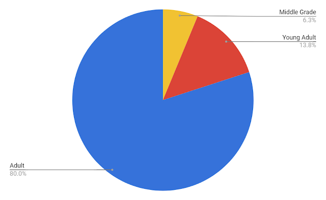 This, as usual, is no surprise. I mainly read books in the adult category (94.2%), and very seldom pick up young adult books (3.9%) these days. I am a bit surprised my middle grade category (1.9%) is so low, though, as I really do love some good middle grade, so I'll have to pay more attention to that one this year!